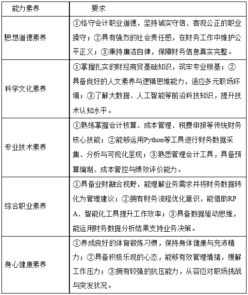 【培养目标】本专业以立德树人、德技并修为根本,深化产教融合,以校企为育人双主体、融通“岗课赛证创”五要素,培养德智体美劳全面发展,恪守“坚持诚信,守法奉公;坚持准则,守责敬业;坚持学习,守正创新”会计职业道德,掌握会计信息化、智能财务、财务大数据分析等核心知识与技能,具备企业会计核算、数字化财务分析与决策、财务风险控制等专业能力,能服务区域经济发展和产业数智化转型的懂业务、精财务、会管理的高素质技术技能人才。