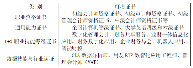【可考证书】本专业紧扣岗课赛证融合育人理念,将职业资格标准与 1+X 证书核心内容深度融入课程教学与实训环节,助力学生考取适配大数据与会计专业职业发展的各类证书,覆盖职业资格、通用能力、1+X职业技能、数据技能与行业认证多个维度,全方位提升学生职业竞争力与岗位适配能力。