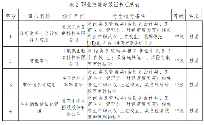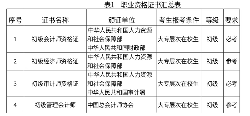 【可考证书】本专业紧扣岗课赛证融合的育人理念,将各类职业资格标准与1+X证书核心内容深度融入日常课程教学与实训环节,助力学生在校期间考取适配职业发展的各类证书,其中可考取的职业资格证书包含初级会计师、全国计算机等级证书、大学英语四/六级等,可考取的技能等级证书包含数字化管理会计、财务共享服务、业财一体信息化应用、财务数字化应用、用友BIP数智化应用工程师、大数据财务分析、企业财务与会计机器人应用等,多证书加持有效提升学生的职业竞争力与岗位适配能力。