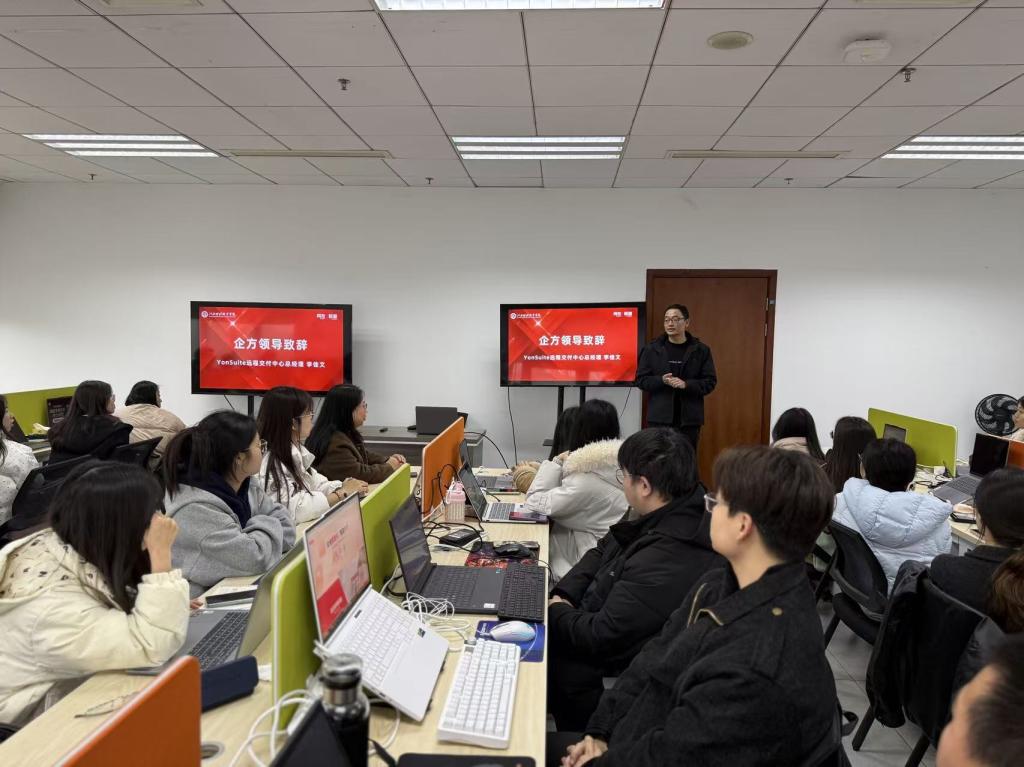 Yonsuite远程交付中心总经理李佳文代表企业方发言,他表示,企业将充分发挥产业资源和实战平台优势,为学员提供真实项目实操机会。学员将通过Yonsuite远程交付中心,直接参与企业真实财务项目运作,依托云端工位完成业财一体化实施全流程实践,真正实现“学习即实战”的培养目标。