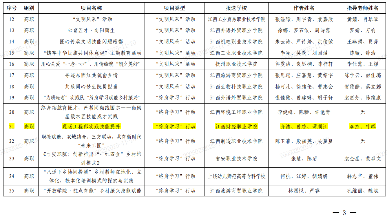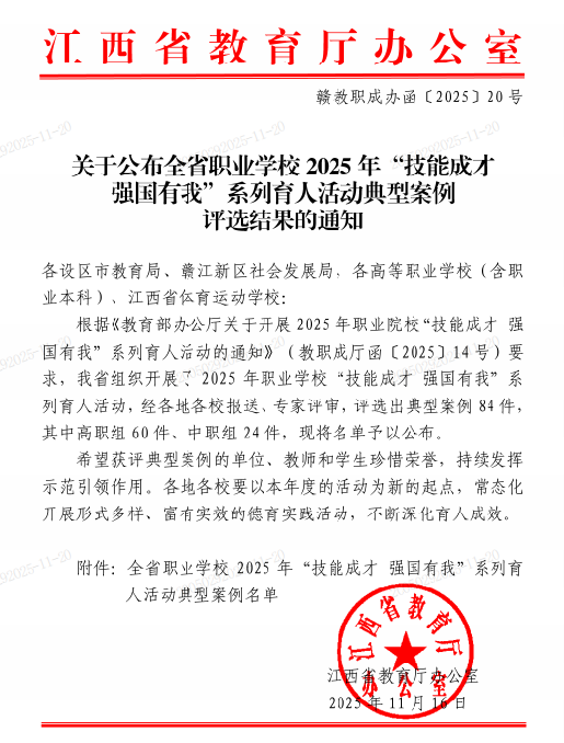 近日,江西省教育厅办公室下发《关于公布全省职业学校2025年“技能成才强国有我”系列育人活动典型案例评选结果的通知》(赣教职成办函〔2025〕20号),我校会计学院申报的《现场工程师实践技能提升》项目成功入选。